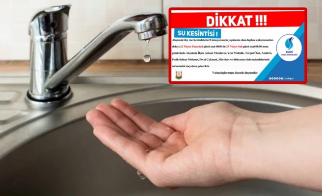 ŞUSKİ’den yapılan açıklamada, “Akçakale ilçe merkezindeki terfi istasyonunda yapılacak olan deplase çalışmasından dolayı 22 Mayıs Pazartesi günü saat 08.00 ile 23 Mayıs Salı günü saat 08.00 arası günlerinde Akçakale İlçesi Adnan Menderes, Yeni Mahalle, Turgut Özal, Atatürk, Fatih Sultan Mehmet, Fevzi Çakmak, Hürriyet ve Süleyman Şah mahallelerinde su kesintisi meydana gelecektir” ifadelerine yer verildi.