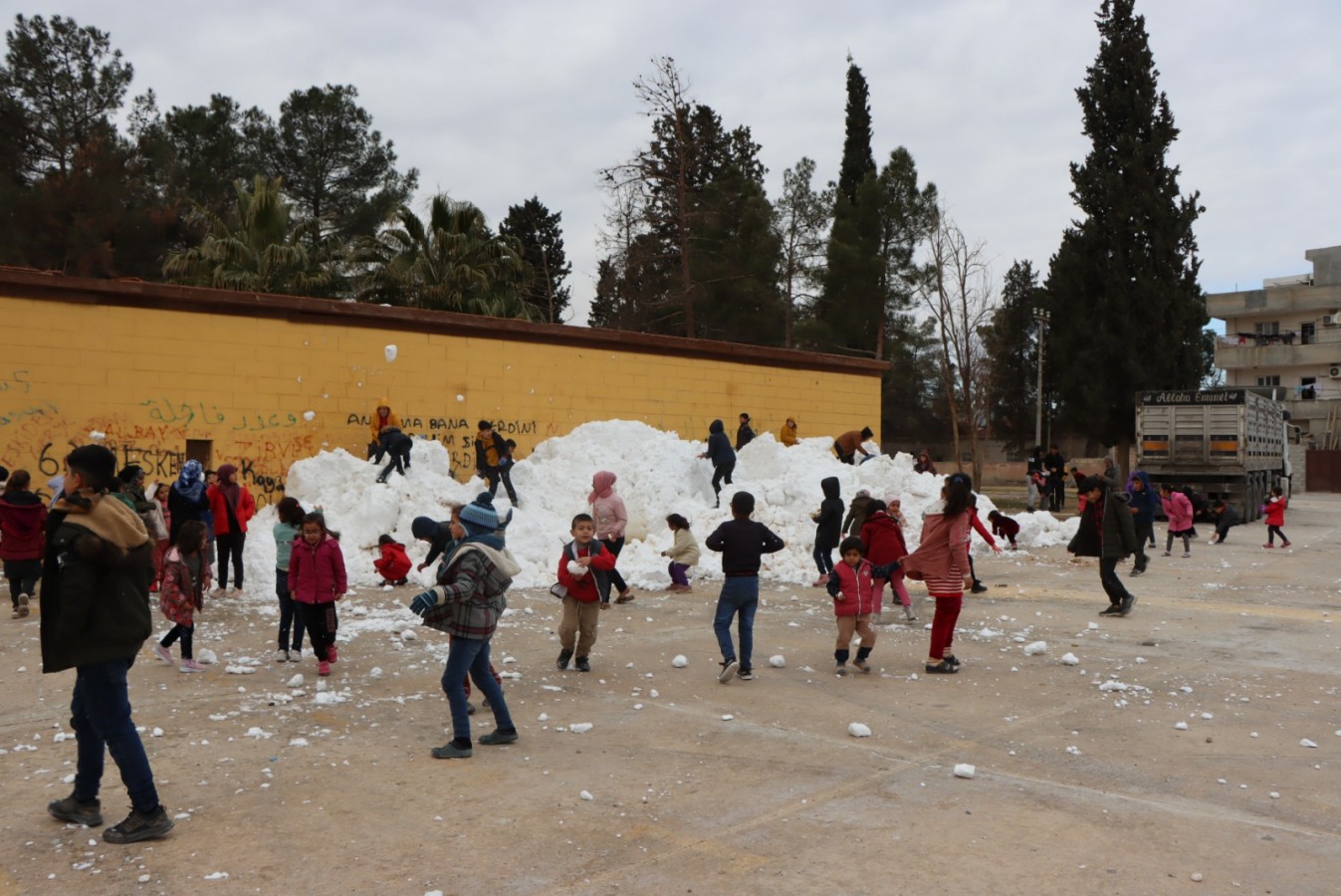 Kamyonlarla ilçeye kar getirildiğini gören çocuklar istasyon meydanında toplandı. Kamyonlardaki karın yerlere dökülmesiyle çocuklar büyük bir sevinç yaşadı.