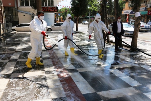 Çalışmalar sırasında cadde ve sokaklar yıkanıp, bina girişleri ve parklar dezenfekte edilerek temizleniyor.