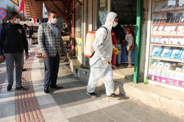 Zabıta ekipleri ilçe genelinde sık sık maske, hijyen ve gıda denetimi yaparken, Park ve Bahçeler Müdürlüğü de salgın ile mücadelede çalışmalar yürütüyor. Kırsalda çalışmalar 3 ekip halinde yürütülürken, merkezde de özellikle işyerleri ve kurum binaları dezenfekte ediliyor. Bu kapsamda son olarak İstasyon Caddesi’ndeki tüm işyerlerinde iç ve dış olmak üzere dezenfekte uygulaması gerçekleştirildi.
