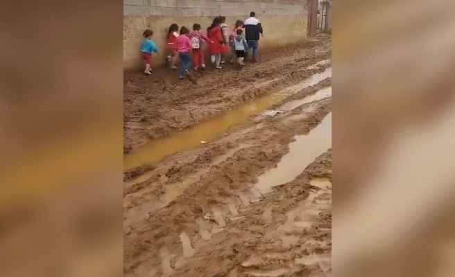 götürürken çamurlu yoldan gelmek zorunda kaldığını aktaran çaresiz veliler