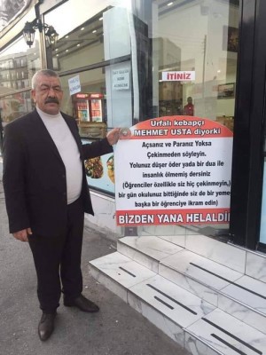 Mehmet usta lokanta girişine "Açsanız ve paranız yoksa çekinmeden söyleyin. Yolunuz düşer öder yada bir dua ile insanlık ölmemiş derseniz. Öğrenciler özellikle siz hiç çekinmeyin. Bir gün okulumuz gittiğinde siz de bir yemeği öğrenciye ikram edersiniz" yazılı tabela astı. Görenlerin tüylerini diken diken eden yazı herkes tarafından takdirle karşılandı.