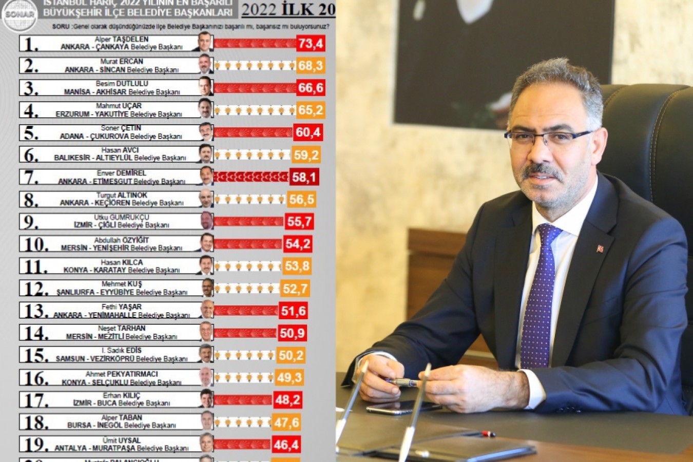 Sonar Araştırma Şirketi’nin Aralık ayında yaptığı 2022 yılının son araştırmasında, İstanbul hariç 2022 Yılının En Başarılı Büyükşehir İlçe Belediye Başkanları listesinin ilk 20 ismi arasında Ankara Çankaya Belediye Başkanı Alper Taşdelen ilk sırada yer alırken, Eyyübiye Belediye Başkanı Mehmet Kuş 12’nci, sırada yer aldı.