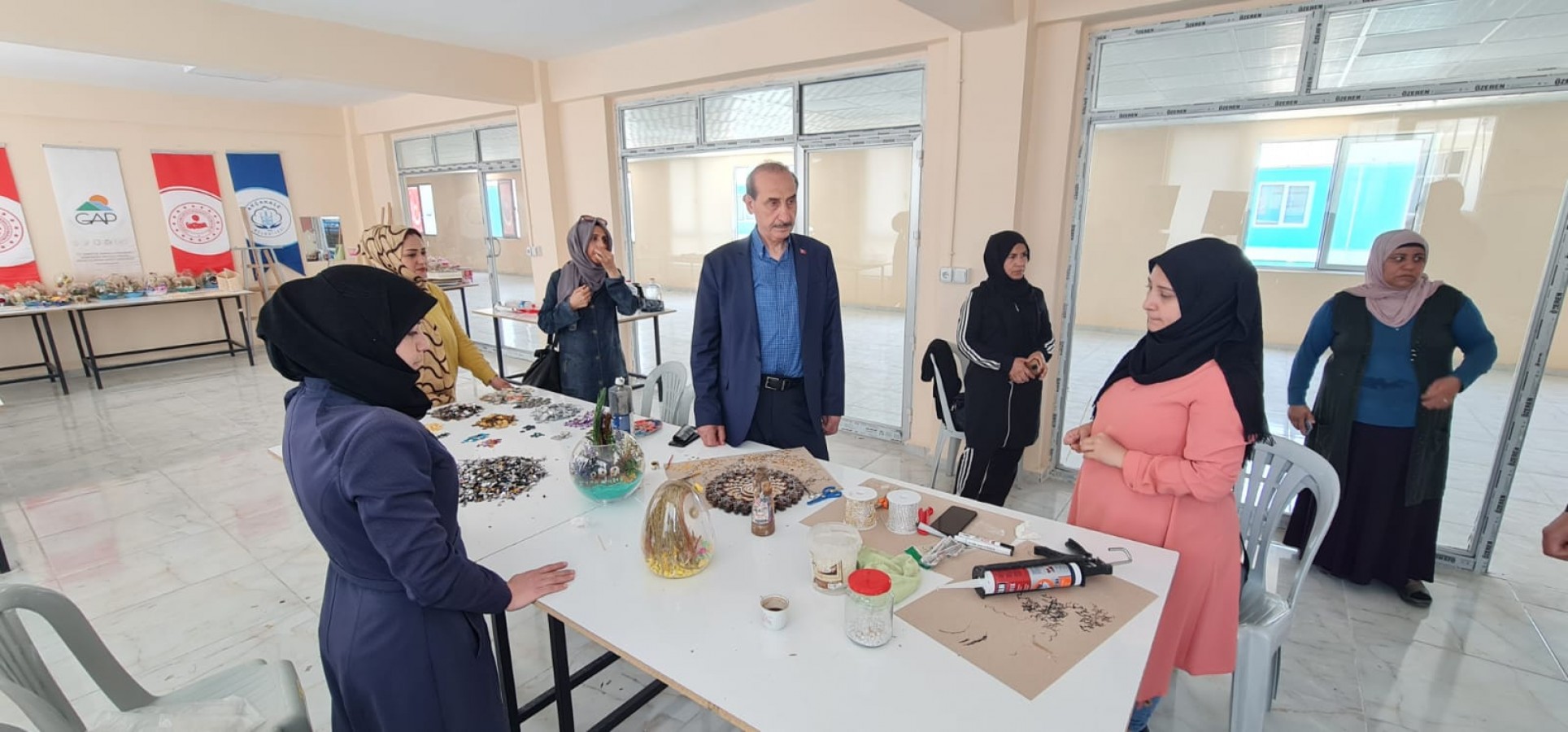 kursiyerler tarafından hazırlanan el emeği göz nuru ürünleri inceledi. Başkan