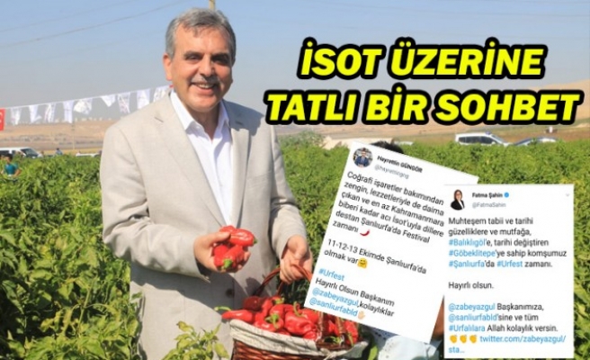 Şanlıurfa Büyükşehir Belediyesi tarafından 'Şanlıurfa Lezzetleri ve İsot Festvali' bu yıl 3'üncü kez düzenleniyor. Şanlıurfa mutfağının hammaddesi olarak da görülen ve hemen hemen her yemekte kullanılan isot, tanıtım için festivalde adını duyurmaya devam ederken, Gazinantep ve Kahramanmaraş'tan festivale destek geldi. Gaziantep'in Büyükşehir Belediye Başkanı Fatma Şahin bir paylaşım yaparak "Muhteşem tabii ve tarihi güzelliklere ve mutfağa, #Balıklıgöl'e, tarihi değiştiren #Göbeklitepe'ye sahip komşumuz #Şanlıurfa'da #Urfest zamanı. Hayırlı olsun. Zeynel Başkanımıza, Büyükşehir Belediyesine ve tüm #Urfalılara Allah kolaylık versin" dedi.