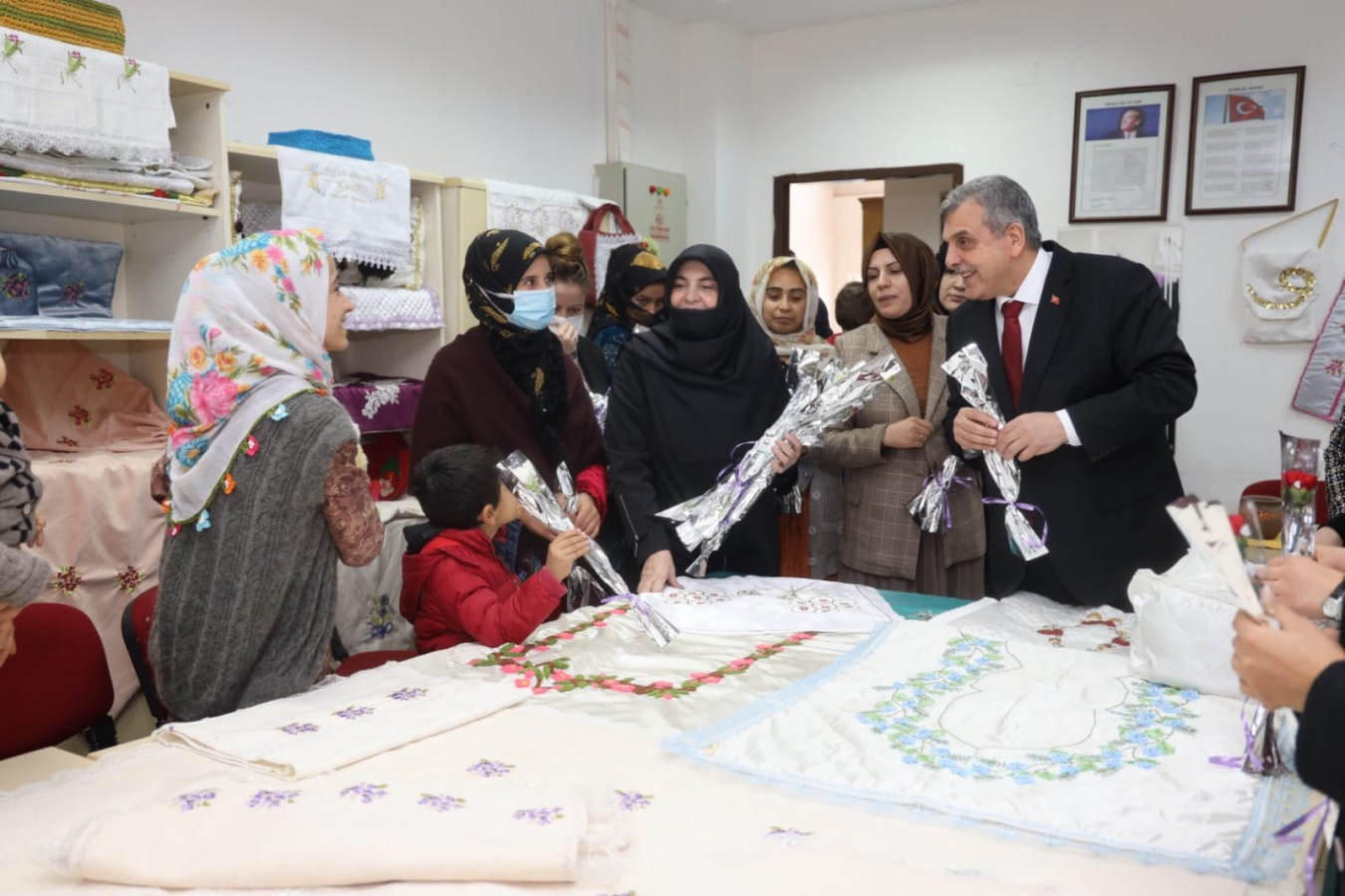 Başkan Beyazgül daha sonra Hayat-i Harrani Kadın Destek ve Eğitim Merkezi’ndeki kadın kursiyerleri ziyaret etti. Eğitim merkezindeki kadın kursiyerlerin 8 Mart Dünya Kadınlar Günü’nü kutlayarak karanfil veren Beyazgül, kadınların yapmış olduğu el işi ürünleri inceledi.