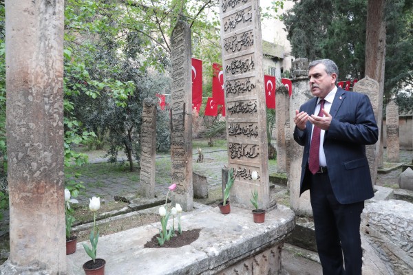 Beyazgül, “Kurtuluşumuzun yıl dönüm öncesi Şanlıurfa Ulu Camii mezarlığındayız. Burada yeni tespit ettiğimiz iki tane şehidimiz var. Biri Rastgeldi Hacı Ahmet Efendi biri de Ercişli Abdulhamit Efendi. Tabi bunların çok güzel hikayeleri var. Rastgeldi Hacı Ahmet Efendi şunu söylüyor; Ben şehit olursam beni zılgıtlarla karşılayın çünkü ben vatan için millet için şehit olmuşum. Yine Ercişli Abdulhamit Efendi de şöyle diyor; O gün güzel ipekten elbiselerini giymiş. Neden böyle giyindiğini sorduklarında, ben şehitliğe hazırlanıyorum şehit olacağım demiş. Biz kendilerine Allah’tan rahmet diliyoruz. Biz bugün eğer güzel günleri yaşıyorsak elbette ki şehitlerimizin ve gazilerimizin fedakar duruşları ile şahadeti göze almaları ile düşmanla çatışmayı, karşılaşmayı göze almalarıdır. Biz hepsine buradan rahmet okuyoruz. Dedelerimizin verdiği büyük mücadeleyi bugün minnetle anıyoruz” şeklinde konuştu.