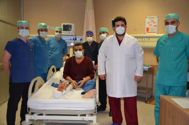 Şanlıurfa'da 8 ay önce bacağından silahla vurularak Şanlıurfa Mehmet Akif İnan Eğitim ve Araştırma Hastanesinesevk edilen 39 yaşındaki Mustafa Çiftçi'ye, Ortopedi Uzmanı Op.Dr. Coşkuner Kalın ve Plastik Cerrahi Uzmanı Op. Dr. Abdullah Sürücü tarafından ilk müdahale yapıldı.