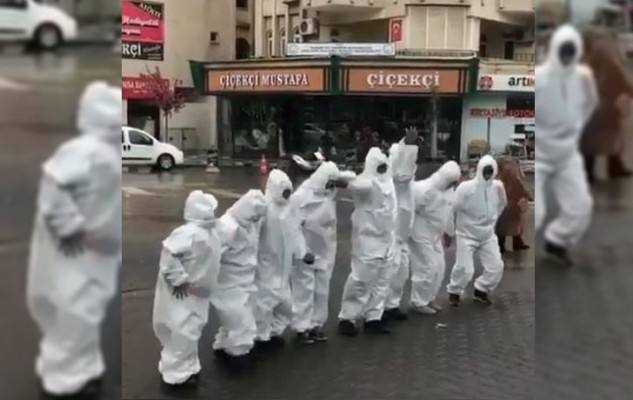 İşçi olduğu tahmin edilen bir grup, Emniyet Caddesinde koruyucu kıyafetler giyerek halay çekti. O anlar cep telefonu kamerası ile kaydedildi. Video Kürtçe mücik eşliğinde paylaşıldı. Video, izleyenleri gülümsetti.