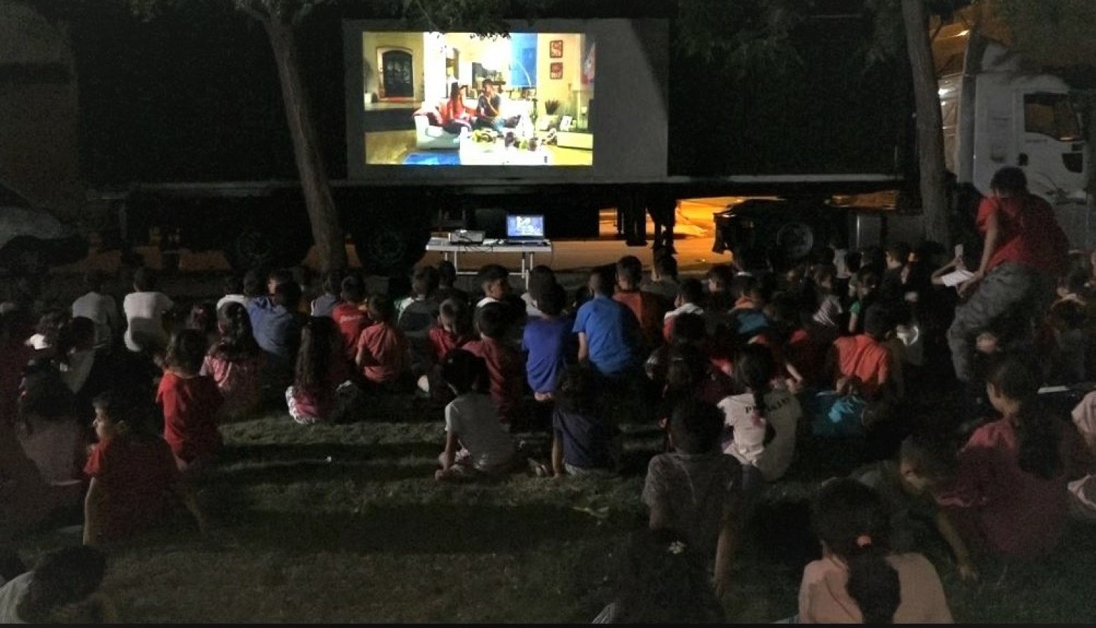 çocuklara açık havada, parkta sinema izleme keyfini yaşattı. Perdeye yansıtılan