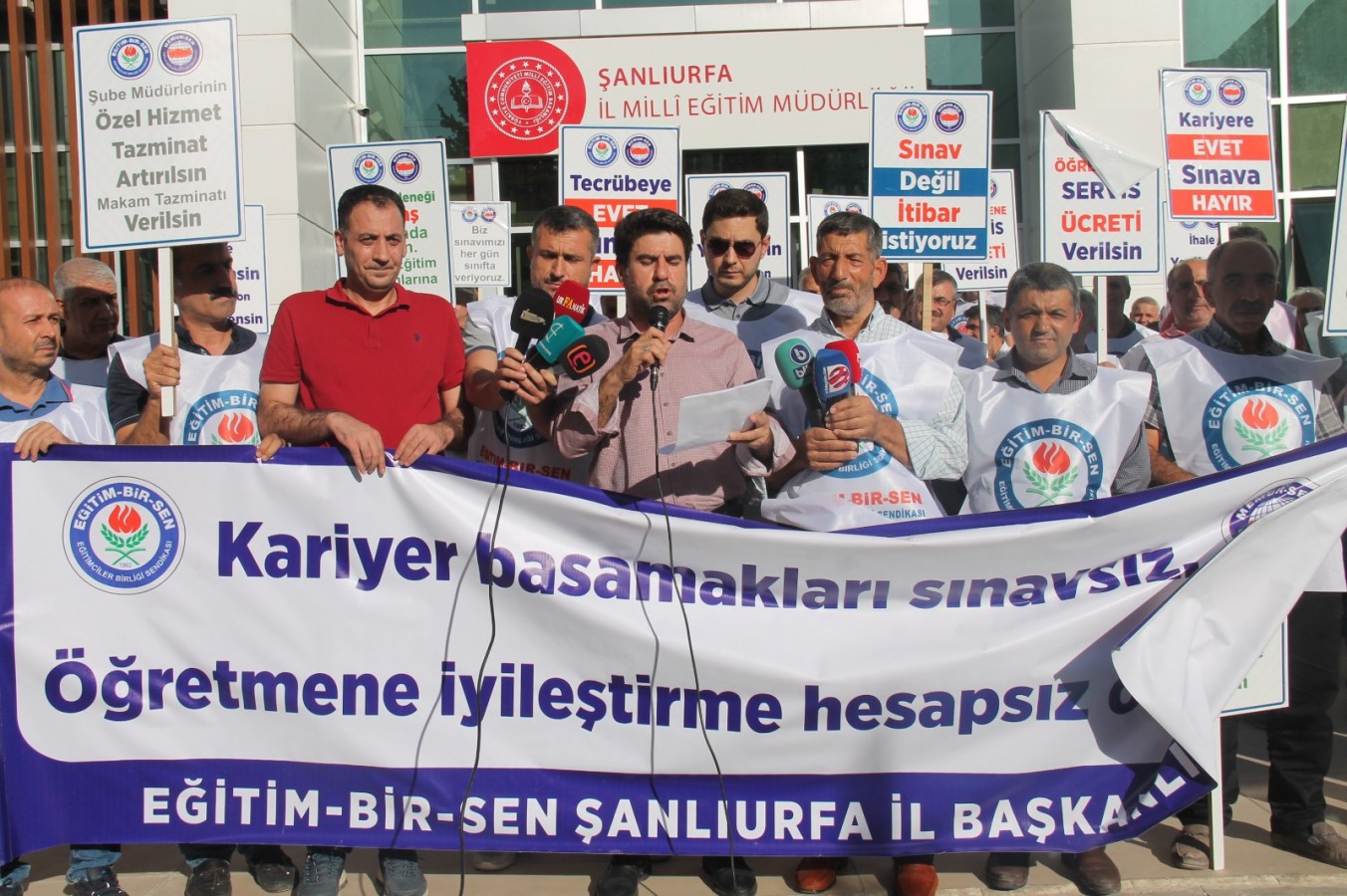 Eğitim Bir-Sen Şanlıurfa Şube Başkanı İbrahim Coşkun, Milli Eğitim Bakanlığı’nın yeni uygulamaya başladığı uzman/başöğretmenlik sınavından öğretmenlere ödenen banka promosyonlarına kadar eğitimcilerin karşı karşıya bulunduğu sorunlarla ilgili basın açıklaması yaptı.