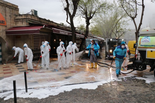 Eyyübiye Belediyesi Temizlik İşleri Müdürlüğü ekipleri, sabahın erken saatlerinde vatandaşların gün içinde yoğunluk oluşturduğu alanlar başta olmak üzere, kaldırımdaki ağaçlardan caddelerde park eden araçlara kadar her yeri dezenfekte etti. Temizlik İşleri Müdürlüğü ekipleri tarafından koordineli edilen ve her gün periyodik olarak gerçekleşen çalışmada ekipler, kaldırımları fırçaladı, cadde ve sokakları temizleyip, yol kenarındaki araçları dezenfekte etti. Balıklıgöl platosundan başlayıp, tarihi çarşılar ve Sarayönü Caddesine kadar süren çalışma, gün boyu ilçe genelindeki tüm mahallelerde periyodik olarak sürüyor.