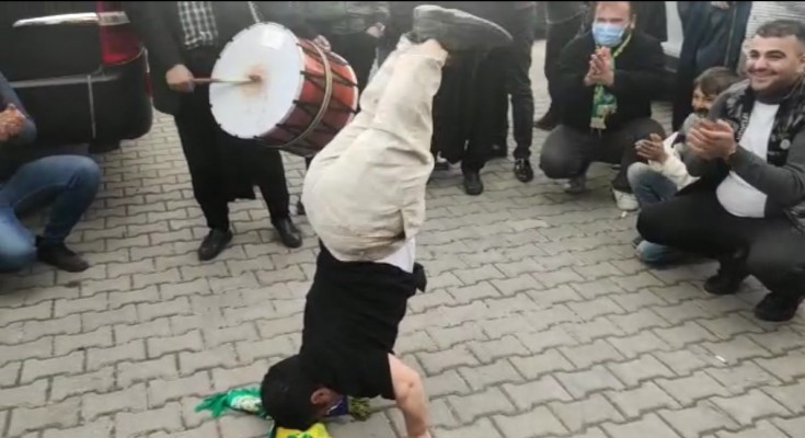 TFF 2. Lig Beyaz Grup’ta mücadele eden Şanlıurfaspor, ligin 33’üncü haftasında 11 Nisan Stadyumu’nda ağırladığı Çorum’u Cihan Can’ın golüyle 1-0 devirerek, ligde kalma yolunda çok önemli bir galibiyet aldı. Şanlıurfaspor’un aldığı bu galibiyet, taraftarlar tarafından sevinçle karşılandı. Karşılaşmayı izleyen taraftarlardan bazıları, maç sonunda galibiyeti davul zurna eşliğinde oynayarak kutladı. Şanlıurfaspor’un amigolarından ‘Maço Ahmet’ lakaplı Ahmet Kayısı, sevincini amuda kalkarak kutlaması dikkat çekti. Ahmet’in ilginç hareketi izleyenlerden alkış aldı.