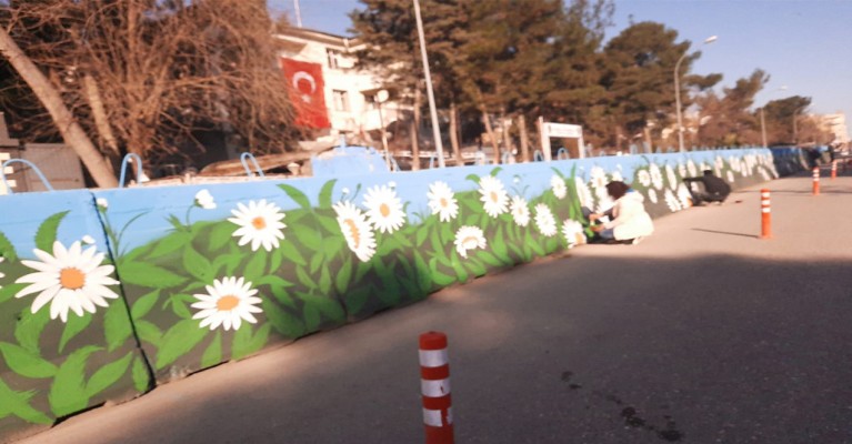 Çalışma kapsamında bir araya gelen gönüllü öğretmenler, ellerine aldıkları boya ve fırçalarla beton bariyerleri renklendirdi. Renklenen beton bariyerler ilçenin sülietini değiştirdi.