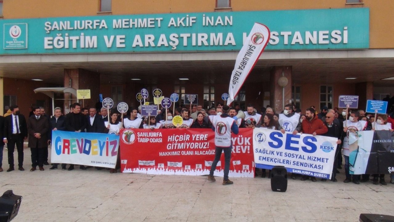 Şanlıurfa’da Mehmet Akif İnan  Eğitim ve Araştırma Hastanesi önünde toplanan Şanlıurfa Tabip Odası ile Sağlık ve Sosyal Hizmet Emekçileri Sendikası (SES) üyesi sağlık çalışanları, bazı siyasi partilerin ve sivil toplum kuruluşlarının temsilcileriyle basın açıklaması yaptı.