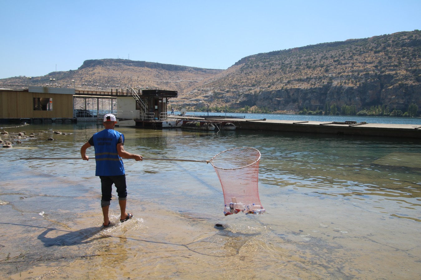 Şanlıurfa'nın Halfeti ilçesinde Büyükşehir Belediyesi Ulaşım Daire Başkanlığı ekiplerince yürütülen temizlik çalışmaları kapsamında baraj gölü üzeri, yüzer duba restoranlar ve tekne turlarının yapıldığı marina çevresi titizlikle temizleniyor.