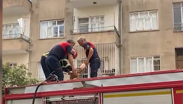 itfaiye aracının üzerine çıkan 3 erin acemiliği dikkatlerden kaçmadı.