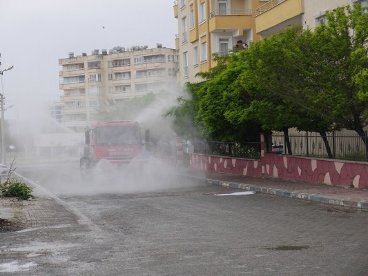Salgın nedeniyle ilan edilen 3 günlük sokağa çıkma kısıtlamasının ilk gününde Haliliye Belediyesi Temizlik İşleri Müdürlüğüne bağlı temizlik ve dezenfektasyon ekipleri, Sancaktar ve Şair Nabi mahallelerinde bulunan cadde ve sokakları köpüklü su ile yıkayarak dezenfekte etti.