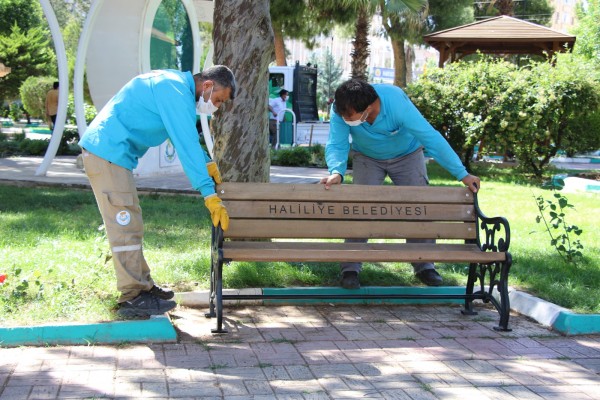 Bu kapsamda Haliliye Belediyesi Çevre Koruma ve Kontrol Müdürlüğü ekipleri belirlenen kurallar dahilinde 1 Haziran'dan itibaren faaliyete geçecek olan park ve bahçelerde peyzaj çalışmalarını hız verirken, koronavirüs salgını nedeniyle yerlerinden sökülen bank, spor ve çocuk oyun grupları yerlerine geri yerleştiriliyor.