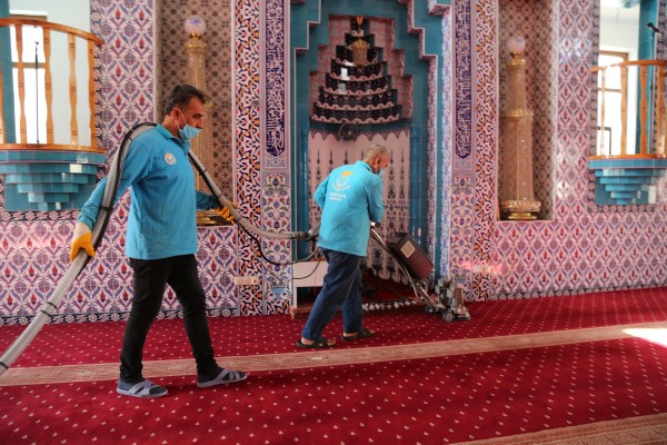 Temizlik İşleri Müdürlüğü, Belediye Başkanı Mehmet Canpolat’ın talimatlarıyla ilçe genelindeki ibadethanelerde hijyen çalışmaları yaptı. Ramazan Bayramı öncesinde ilçede bulunan cami ve mescitlerin halılarını yerinde temizleyen temizlik ekipleri, Kovid-19 salgını önlemleri kapsamında da dezenfekte çalışması yaptı. Görevli personeller, cami halılarını yerinde temizlediği çalışmalarını, gün boyu devam ettirdi.