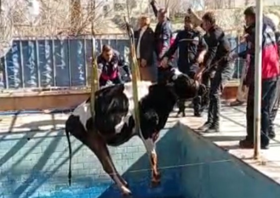 Haliliye İlçesine bağlı Devteşti Mahallesi’nde 9691’inci sokakta, yüzme havuzuna inek düştü. Olayı gören çevredeki vatandaşlar, Şanlıurfa Büyükşehir İtfaiye Daire Başkanlığına ihbarda bulundu. Olay yerine gelen itfaiye ekipleri, iş makinesi ve vatandaşların yardımıyla ineği havuzdan çıkardı.
