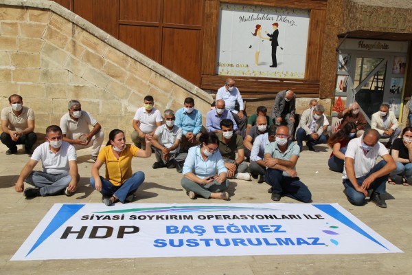 Ankara Cumhuriyet Başsavcılığı, 2014'te düzenlenen Kobani eylemlerine ilişkin soruşturma kapsamında 7 ilde 82 kişi için gözaltı kararı verirken, 17 kişinin gözaltına alınmasına tepki gösteren HDP Urfa İl Örgütü, parti binası önünde oturma eylemi yaptı.