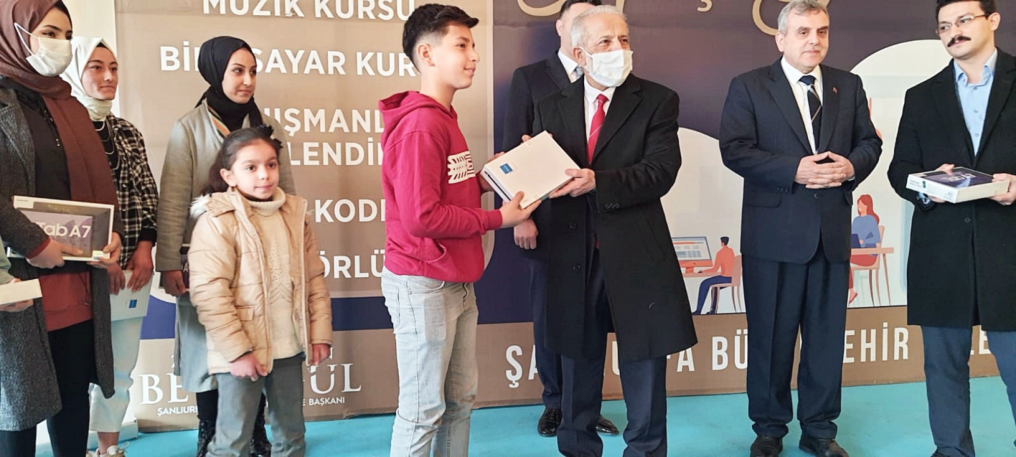 Yenice Toplum Merkezi'nin açılışından sonra “Yenilikçi Faaliyetlerin Şanlıurfa Göçmen Danışma ve Koordinasyon Merkezinde Yaygınlaştırılması” projesi kapsamında kurslarda yüksek performans göstererek eğitimlerini tamamlayan 110 öğrenciye Büyükşehir Belediye Başkanı Zeynel Abidin Beyazgül ve Harran Üniversitesi Rektörü Prof. Dr. Mehmet Sabri Çelik tarafından tablet, çanta, tişört gibi çeşitli hediyelerin dağıtımı yapıldı.