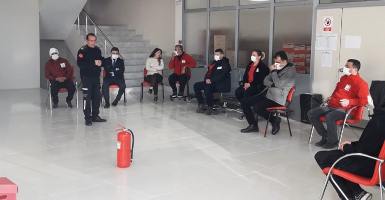 "Sosyal mesafe kuralına uyularak yangın güvenlik önlemleri eğitimlerine devam ediyoruz."