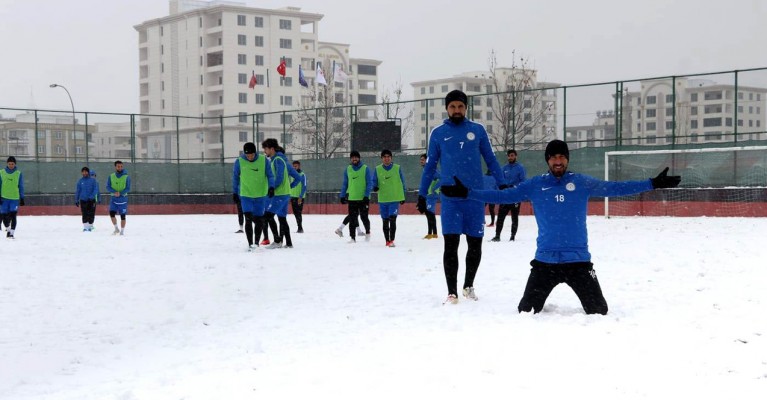 Karaköprü Belediyespor, evinde oynayacağı Yomraspor maçı hazırlıklarına, kar yağışına rağmen devam ediyor.