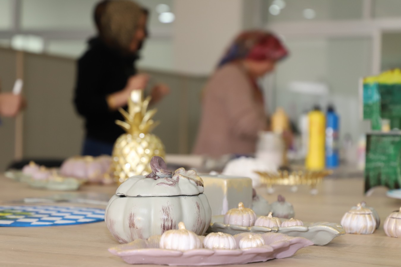 Kültür merkezinde usta öğreticiler tarafından verilen; dikiş-nakış, takı tasarımı ve halı dokuma gibi kurslarda el becerilerini geliştiren kadınlar, diğer yandan da kendi üretimleri olan ürünleri satarak aile bütçelerine katkıda bulunuyor.