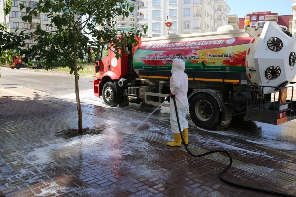 Normalleşme sürecinde de tedbiri elden bırakmayan Karaköprü Belediyesi Temizlik İşleri ekipleri, koronavirüs tehdidine karşı ilçede bulunan caddeler, mahalleler, otobüs durakları, bina içleri, parklar ve oyun alanları başta olmak üzere tüm ortak kullanım alanlarını düzenli olarak dezenfekte ediyor.
