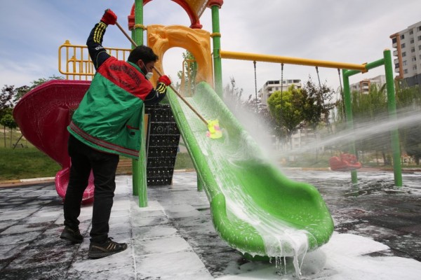 Karaköprü Belediye Başkanı Metin Baydilli'nin talimatıyla ilçedeki parklarda sokağa çıkacak çocukların hijyenik bir ortamda zaman geçirmesi için dezenfekte ve hijyen çalışması gerçekleştirildi.