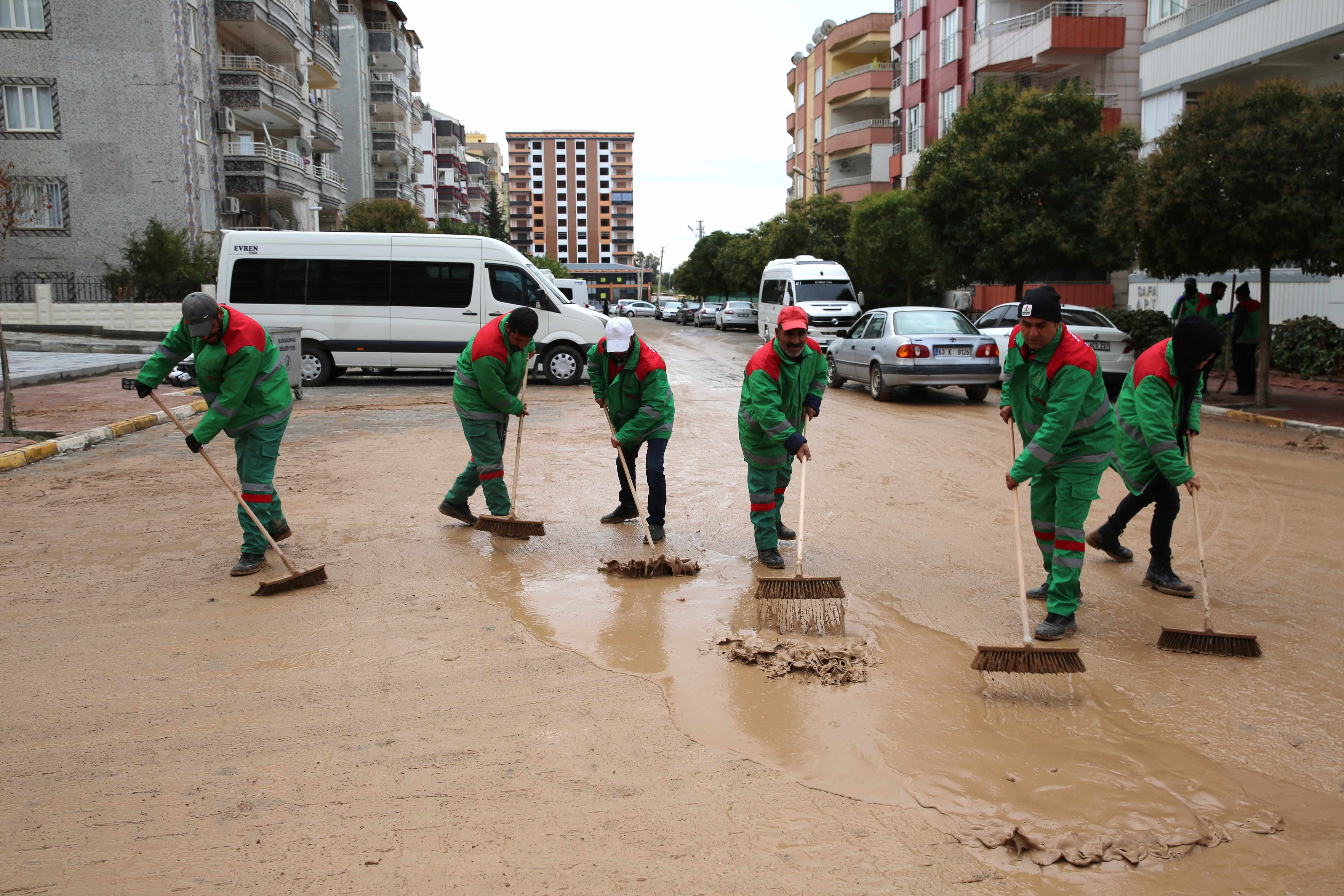 sonrası oluşan çamurlaşmayı temizlemek için hemen çalışmalara başladı.