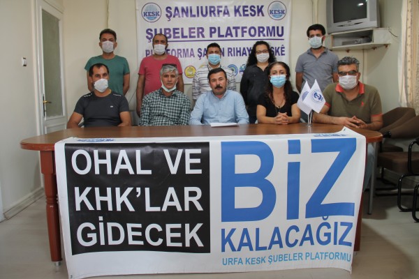 Kamu Emekçileri Sendikası (KESK) Urfa Dönem Sözcüsü ve Sağlık ve Sosyal Hizmet Emekçileri Sendikası (SES) Urfa Şube Eşbaşkanı Salih Karataş, Kanun Hükmünde Kararnameler (KHK) ile ihraç edilen kamu çalışanları için açıklama yaptı.