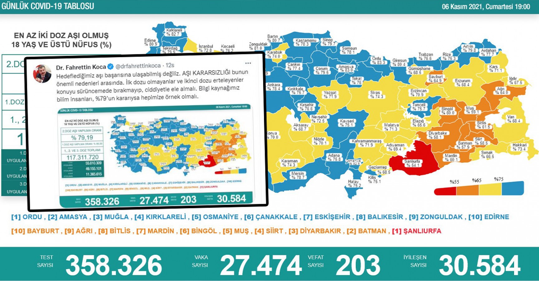 Bakanlığın tablosuna göre yüzde 54,1 ile Türkiye'de en az aşılamanın gerçekleştirildiği Şanlıurfa’yı sırasıyla Batman, Diyarbakır, Siirt, Muş, Bingöl, Mardin, Bitlis, Ağrı ve Bayburt takip etti.