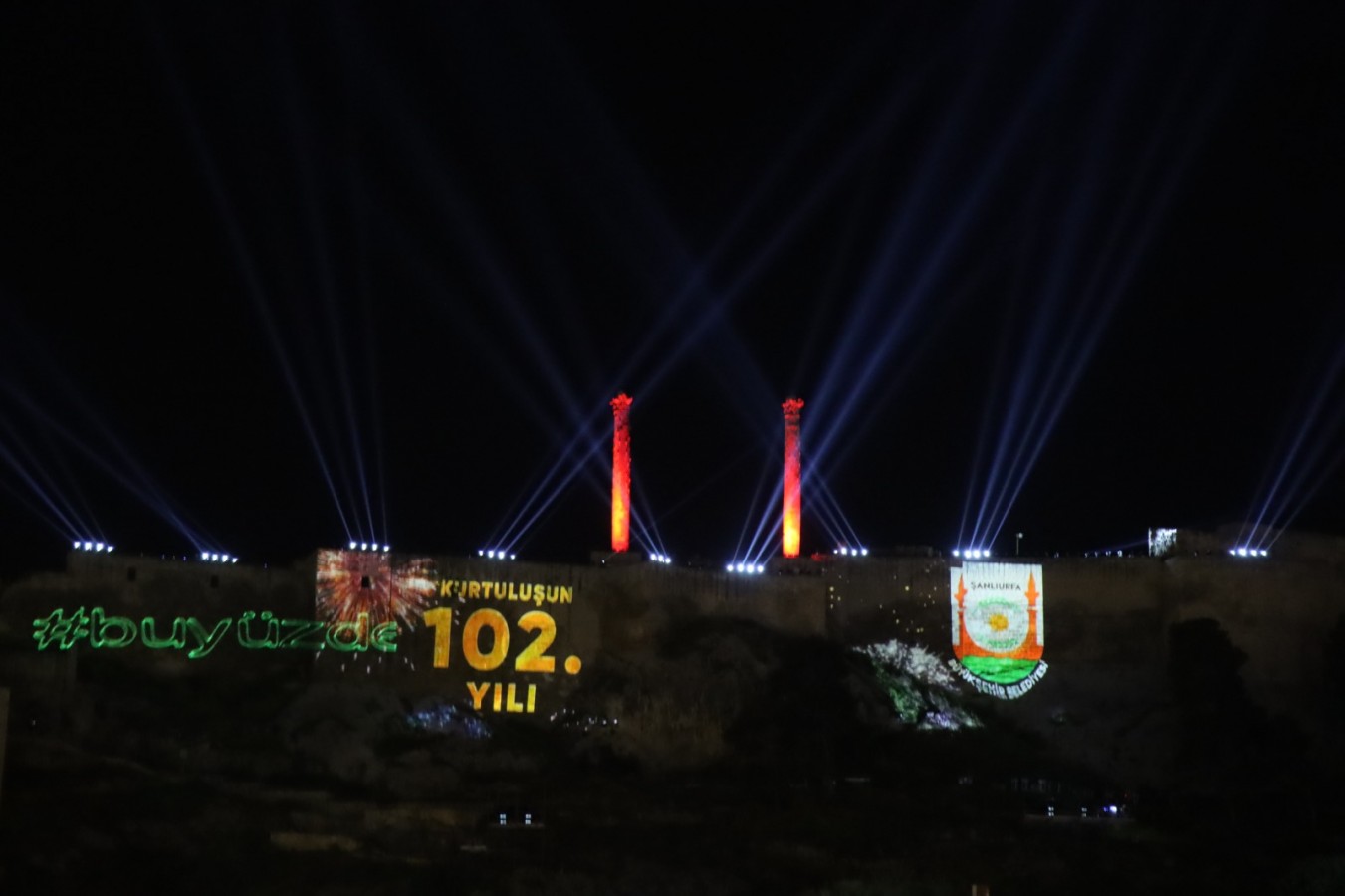 Tarihi Urfa Kalesine yansıtılan Kurtuluş temalı ışık ve