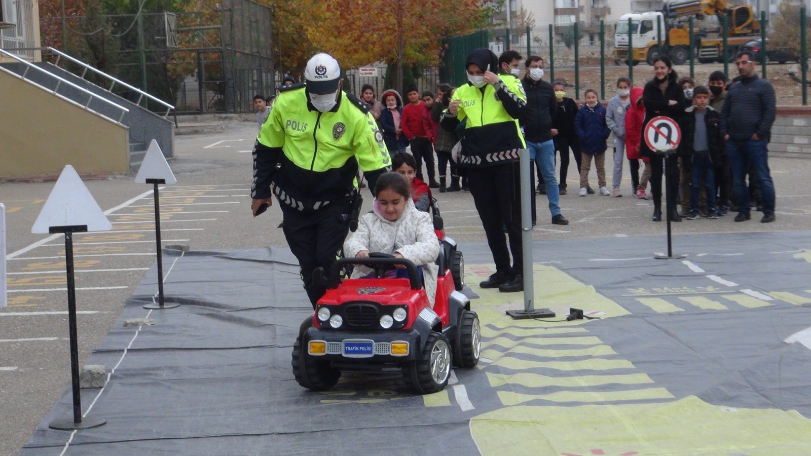 Tırdaki mobil sınıfta trafik eğitimi gören öğrenciler, trafik işaretlerinin yer aldığı alanda ise trafik polisleri eşliğinde akülü araç kullanarak uygulamalı eğitimle trafik kuralları hakkında bilgilendirildi.