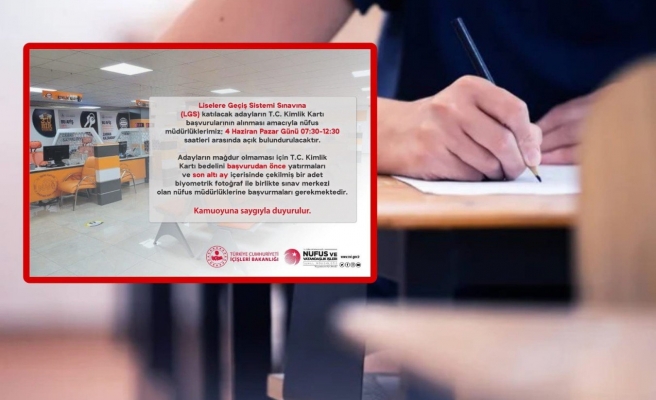 Liselere Geçiş Sistemi Sınavına (LGS) katılacak adayların T.C. Kimlik Kartı başvurularının alınması amacıyla nüfus müdürlüklülerimiz; 4 Haziran Pazar günü 07.30-12.30 saatleri arasında açık bulunduracaktır. Adayların mağdur olmaması için T.C. kimlik kartı bedelini başvurudan önce yatırmaları ve son 6 ay içinde çekilmiş bir adet biyometrik fotoğrafla birlikte sınav merkezi olan nüfus müdürlüklerine başvurmaları gerekmektedir".