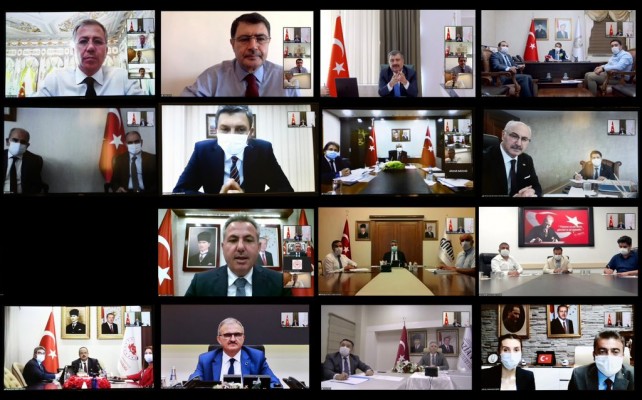 Bakan Koca ile Vali Vekili Metin Esen, İl Sağlık Müdürü Doç. Dr. M. Emre Erkuş ve Halk Sağlığı Hizmetleri Başkanı Dr. Öğr. Üys. Abdullah Solmaz'ın video konferans yöntemiyle bir araya geldiği toplantıda, salgına karşı alınacak tedbirler ele alındı.