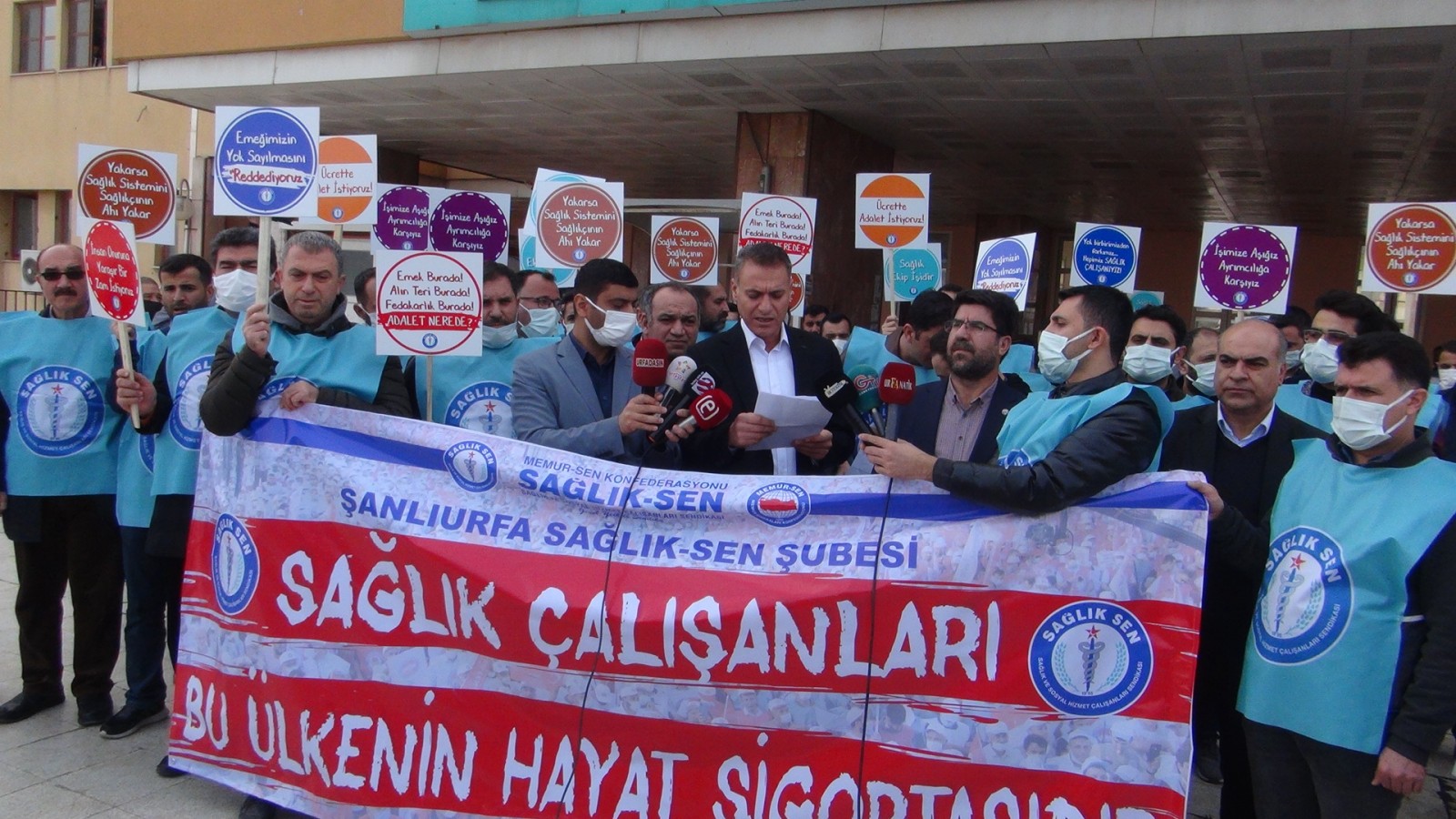 ŞANLIURFA – Memur Sendikaları Konfederasyonu’na bağlı Sağlık ve Sosyal Hizmet Çalışanları Sendikası (Sağlık-Sen) Şanlıurfa Şubesi üyeleri öğle saatlerinde Şanlıurfa Mehmet Akif İnan Eğitim ve Araştırma Hastanesi önünde toplandı.