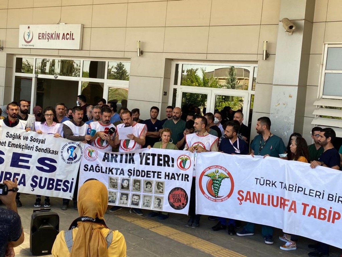 Şanlıurfa Eğitim Araştırma Hastanesinde önünde toplanan Sağlık ve Sosyal Hizmet Emekçileri Sendikası (SES), Şanlıurfa Tabip Odası, Şanlıurfa Aile Hekimleri Derneği (Tabip ve Diğer Sağlık Çalışanları Sağlık ve Sosyal Hizmetler Kamu Görevlileri Sendikası (TABİP-SEN) üyesi sağlık çalışanları Şanlıurfa Eğitim Araştırma Hastanesinde bir sağlık çalışanın hasta yakınlarınca darp edilmesine tepki gösterdi.