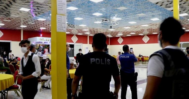Polis, zabıta ve sağlık personelinin de devriye halinde kontrol ettiği düğünlerde yemek verilmemesi, maske takılması, fiziki mesafe kurallarının ihlal edilmemesi, salon girişlerinde ateş ölçümü ve dezenfektan kullanımı gibi hususlar denetlendi.