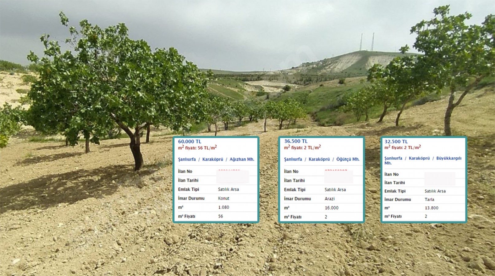 Karaköprü’de kırsal mahallerde bunlara benzer komik rakamlarla internette satışa çıkarılmış çok sayıda ilan bulunuyor.
