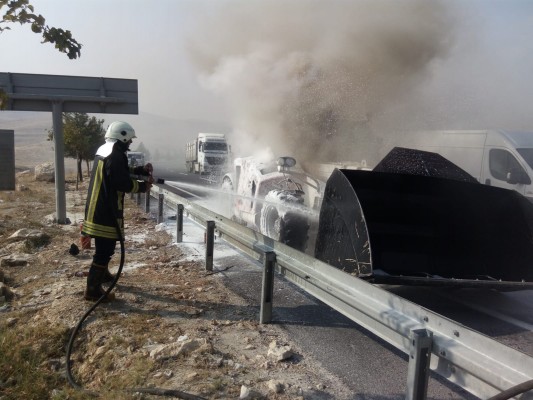 Yetimoğlu Mucur Ocağı mevkisindeki olayda, seyir halindeki iş makinesi aniden alev aldı.