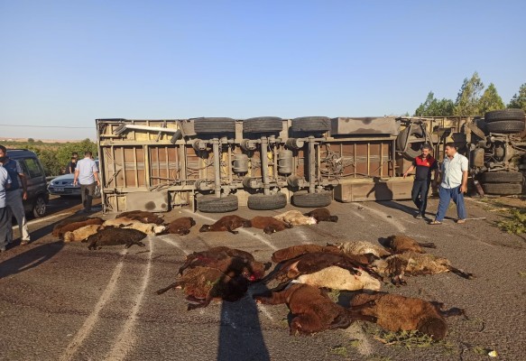 Kaza, Şanlıurfa-Gaziantep yolu üzeri Mirkelam Tesisleri yakınlarında meydana geldi. Emin Malazgirt yönetimindeki 25 ABD 571 plakalı koyun yüklü TIR, sürücüsünün direksiyon hâkimiyetini kaybetmesi sonucu kontrolden çıkarak devrildi. Kaza sonucu aracın dorsesinde yola saçılan 42 koyun telef olurken, sürücü ise yaralandı. Olay yerine çağrılan 112 acil sağlık ekiplerinin ilk müdahalede bulunduğu yaralının durumunun iyi olduğu öğrenildi.