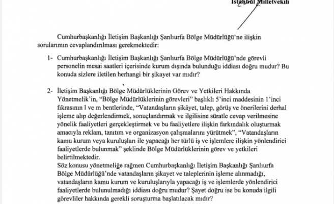Cumhuriyet Halk Partisi (CHP) İstanbul Milletvekili Şanlıurfalı Mahmut Tanal, konuyu geçtiğimiz ay verdiği soru önergesi ile gündeme taşıdı. Cumhurbaşkanı Yardımcısı Fuat Oktay'a seslenen Vekil Tanal "Cumhurbaşkanlığı İletişim Başkanlığı Şanlıurfa Bölge Müdürü görevden alındı. Bölge Müdürlüğü hakkındaki iddialara ilişkin soru önergemiz ise hala cevaplandırılmadı. Müdür görevden alınmış olabilir ama sorularımızın cevabını bekliyoruz. Bu meselenin takipçisiyiz" dedi.