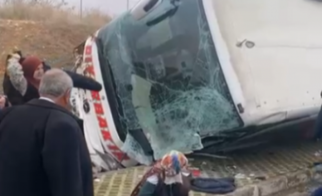 Kazada çarpışmanın etkisiyle yolcu otobüsü yoldan çıktı ve devrildi.