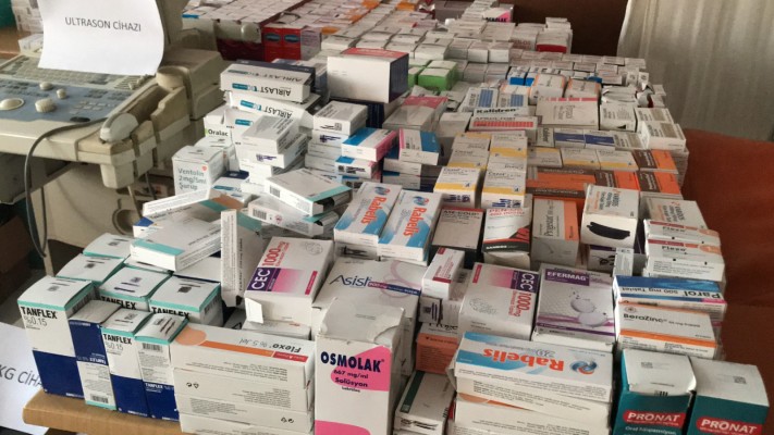 Sağlık kabinlerinde yapılan aramada, çeşitli marka ve türde 5 bin 250 kutu ilaç, 55 muayene cihazı ve çeşitli malzemeler ele geçirildi.