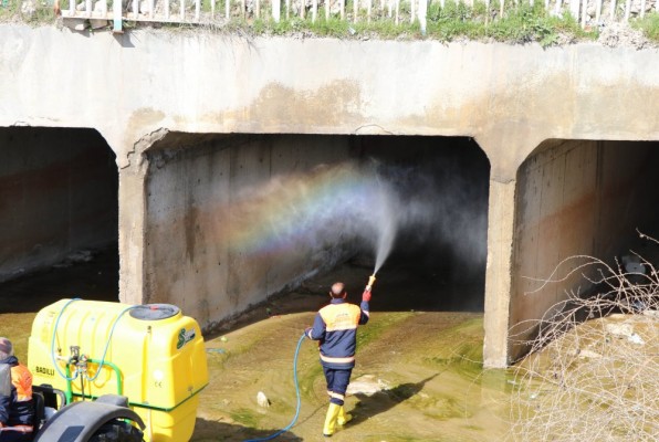 Karaköprü, Sırrın ve Çavşak derelerini temizleyen ekipler oluşabilecek larvalama dönemine karşılık ilaçlama işlemlerine devam ediyor.