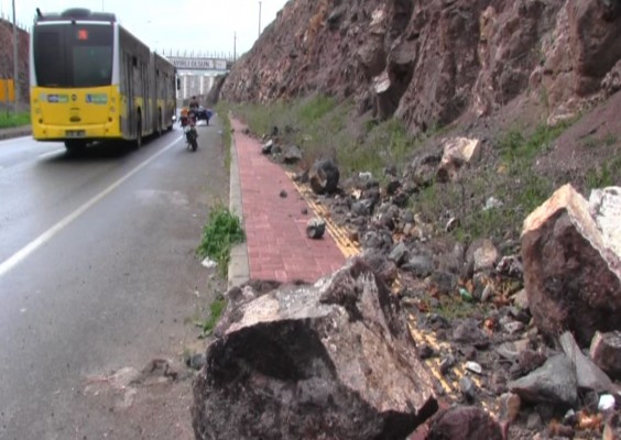 Kaldırıma ve yola düşen kayalıklar hem yayalara hem de sürücülere zor anlar yaşatıyor. Kayaların olası kazalara davetiye çıkardığını kaydeden vatandaşlar, yetkililerin en kısa sürede önlem almasını bekliyor.